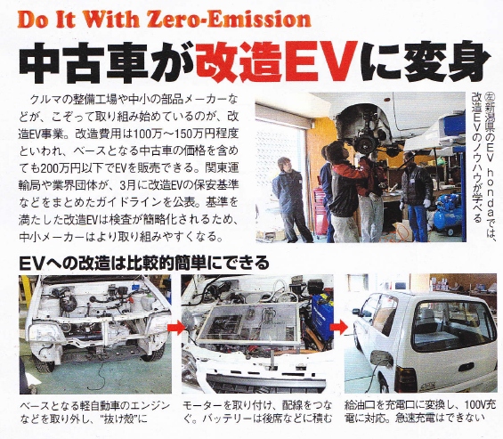 ・ガソリンエンジン車をEVに改造し、高性能のメーカー系EVとは異なった、近距離移動に特化したEVをより低価格で提供することにより、EVの普及を促