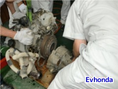 ガソリンエンジンを取り外し、電気モーターを取り付ける。取付モーターは、ツシマエレクトリック(広島県)製造の「R031BF 回生モーター」を使用。
